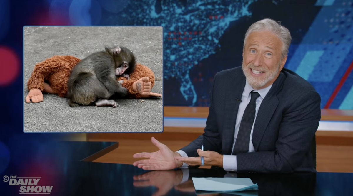 The internet is rooting for Punch, the tiny abandoned monkey who found comfort with a stuffed toy — but Jon Stewart has other ideas.